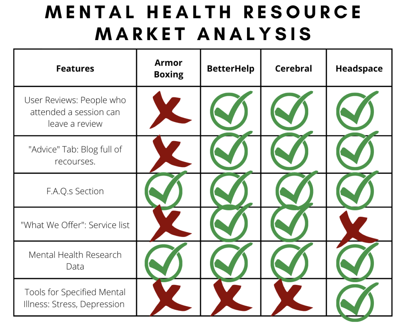 In the competitive analysis, I searched how successful mental health organizations helped their users. We loved the resources tab that BetterHelp and Cerebral offered to their users. Due to BlueHosts constraints (Armor Boxing Website Builder), we could only use Cerebral as inspiration due to BetterHelps UI.